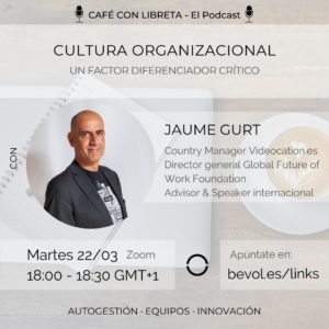 Os traemos un nuevo episodio de Café con libreta, en esta ocasión acompañados de Jaume Gurt, Country Manager de Videocation.es, Director General de Global Future of Work Foundation, Advisor y conferenciante internacional, y autor del libro Diseña tu futuro: Atrévete a ser tú: ser feliz en el trabajo es posible.